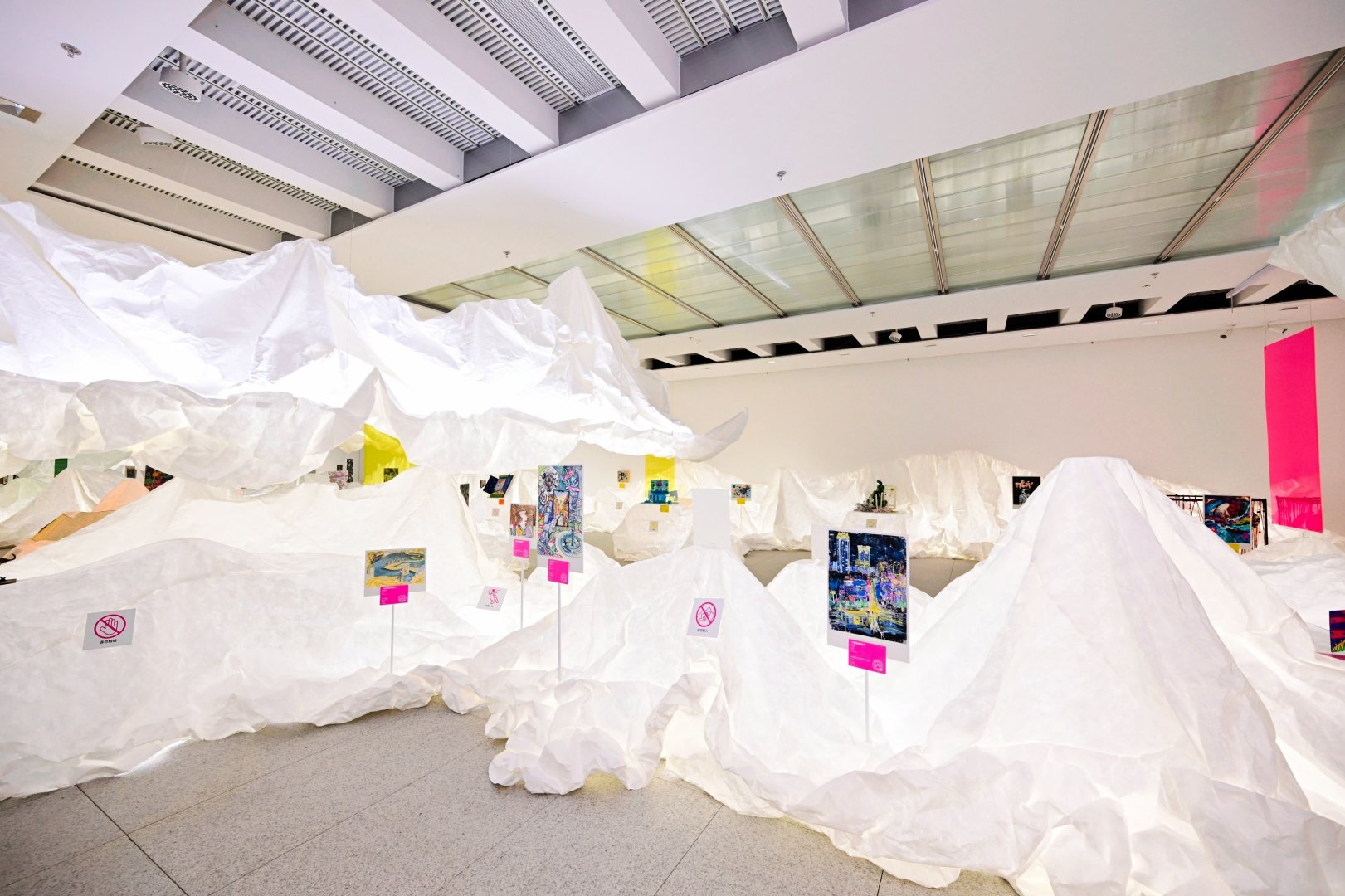 浦东美术馆邀请著名工业设计师杨明洁担任本次展览展陈设计师。展览动线由入口“虚山水”装置进入到一个梦幻空间,白色半透的特卫强纸质材料贯穿全场,通过裁剪、褶皱、堆叠、悬挂等方式塑形,带有呼吸感的背透光效设计增加了现场质感与互动趣味,仿佛置身于一个穿越时空后的超现实虚构世界,以此呼应“打开时间之门”的展览主题。