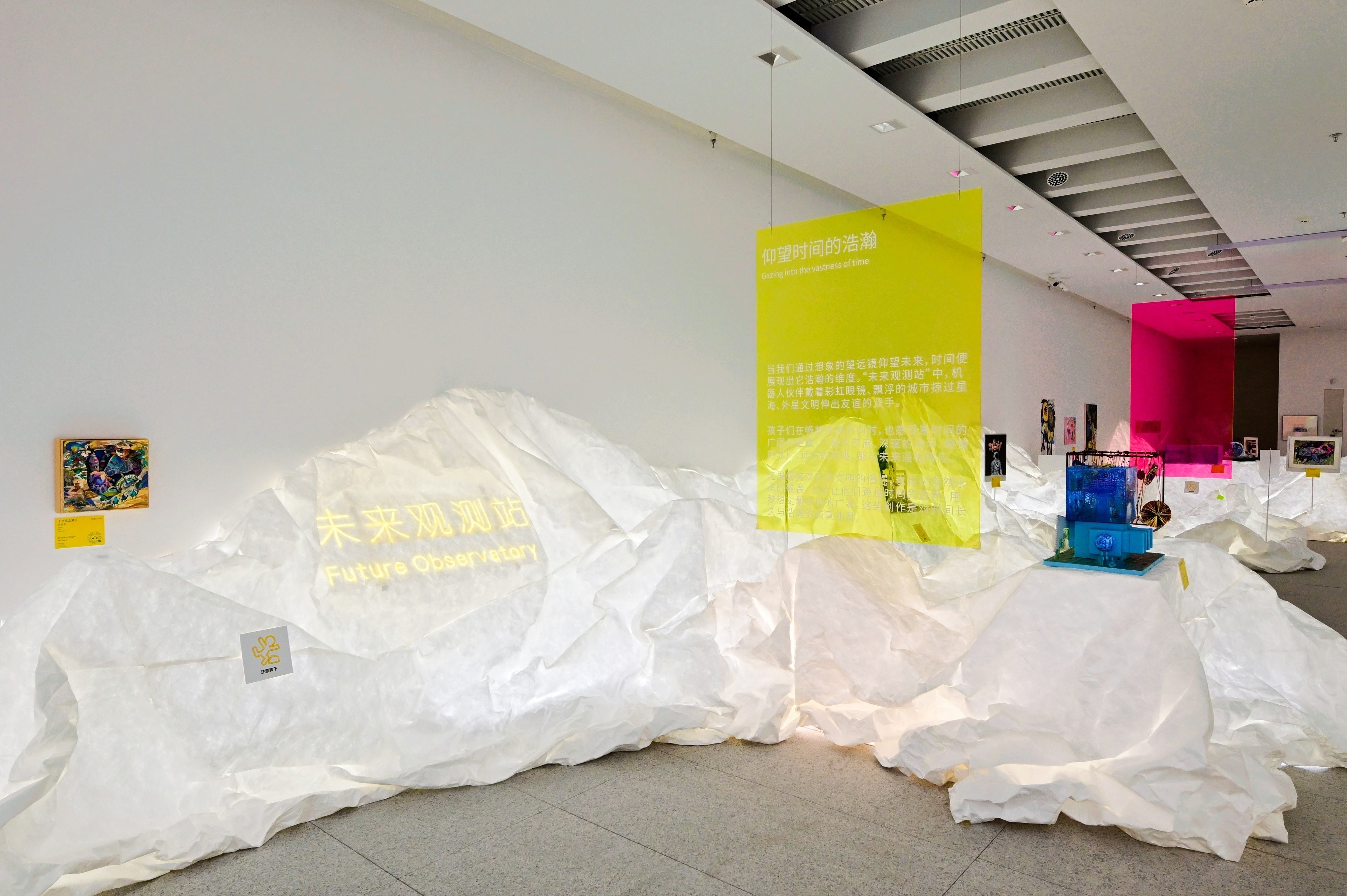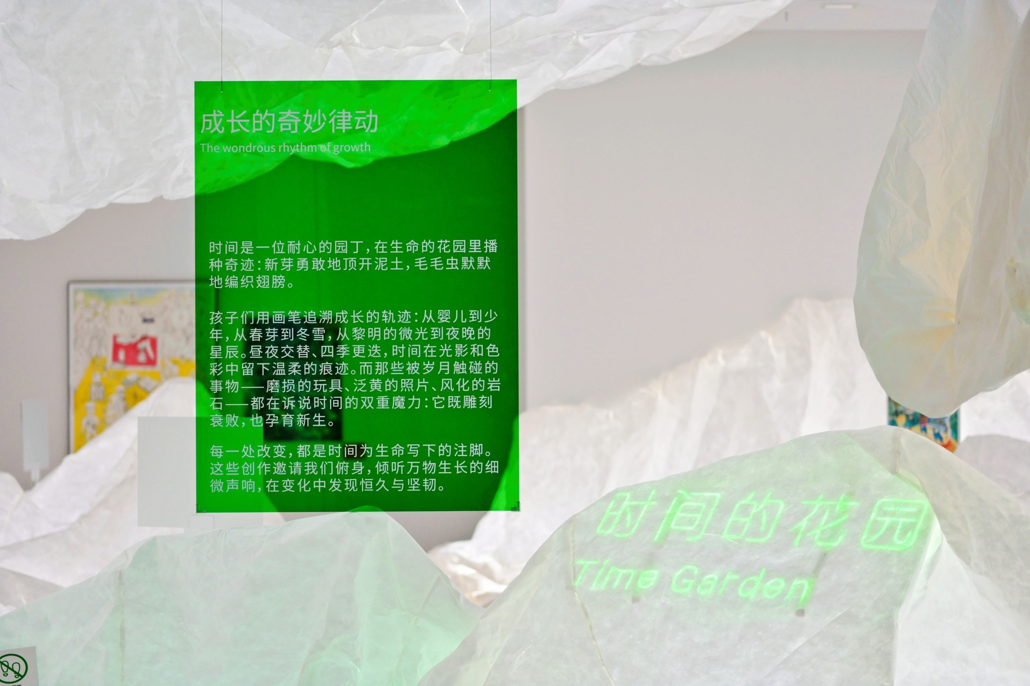 展厅中,“时间的花园”、“时光魔法毯”、“未来观测站”、“记忆收藏夹”四个充满童话感的主题,精心呈现小艺术家们充满童真的作品,邀请不同年龄段的观众们来到这里,静静聆听孩子们用创意诉说的时空故事。
